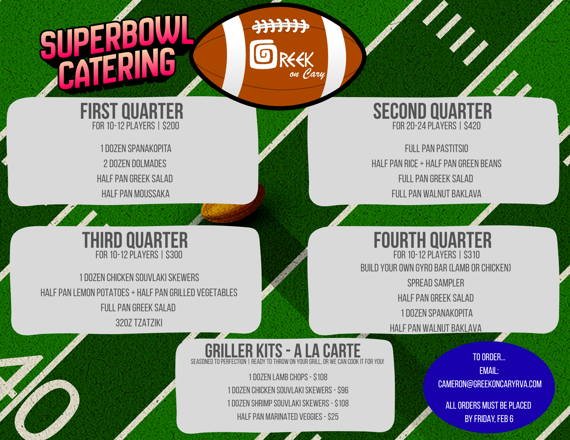 Let's start the party! From office lunches, to an at home celebration, Greek On Cary will exceed your expectations at your next event.